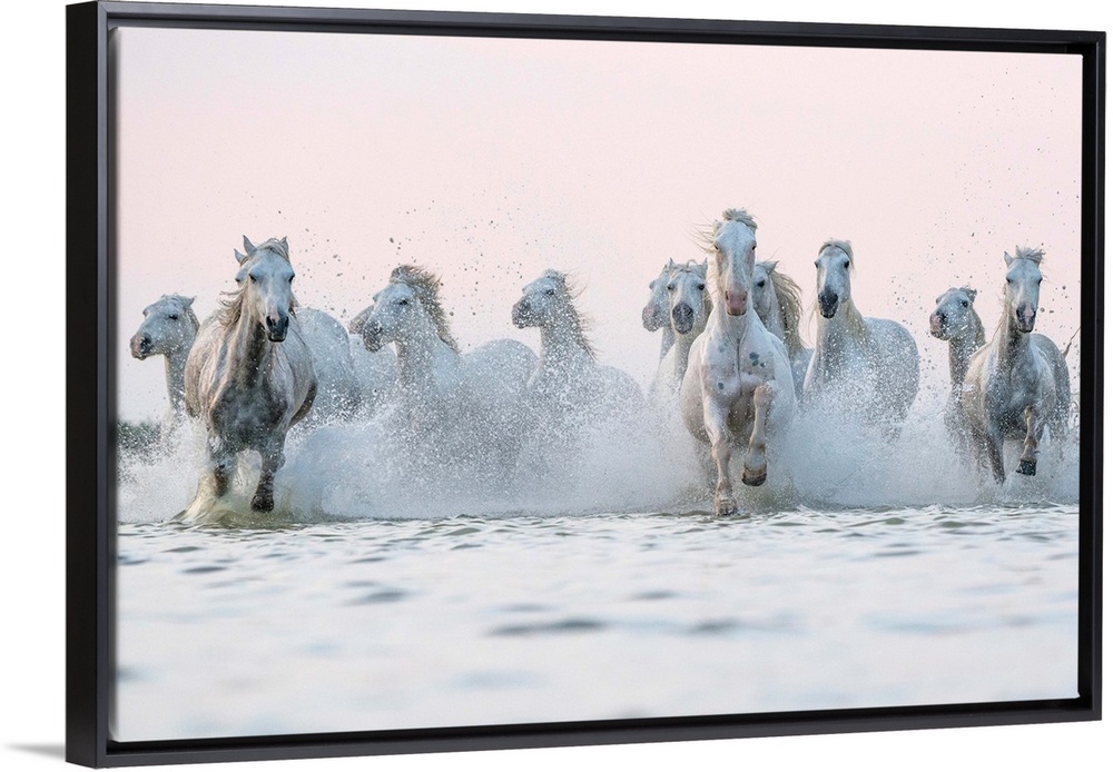 <p>White horses of Camargue running out of the water; Camargue, France</p>