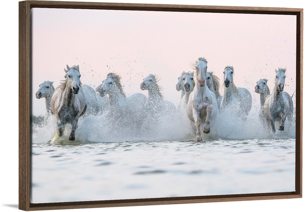 <p>White horses of Camargue running out of the water; Camargue, France</p>