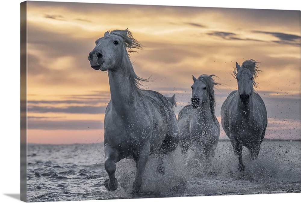 <p>White horses of Camargue running out of the water; Camargue, France</p>