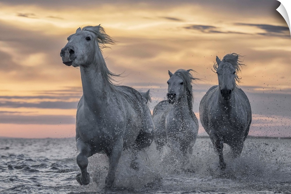 <p>White horses of Camargue running out of the water; Camargue, France</p>