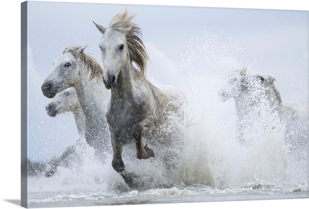 <p>White horses of Camargue running out of the water; Camargue, France</p>