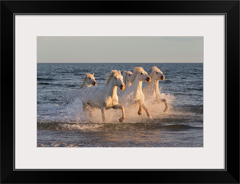 <p>France, Provence, Camargue, White horses of the Camargue run through the mediterranean sea</p>