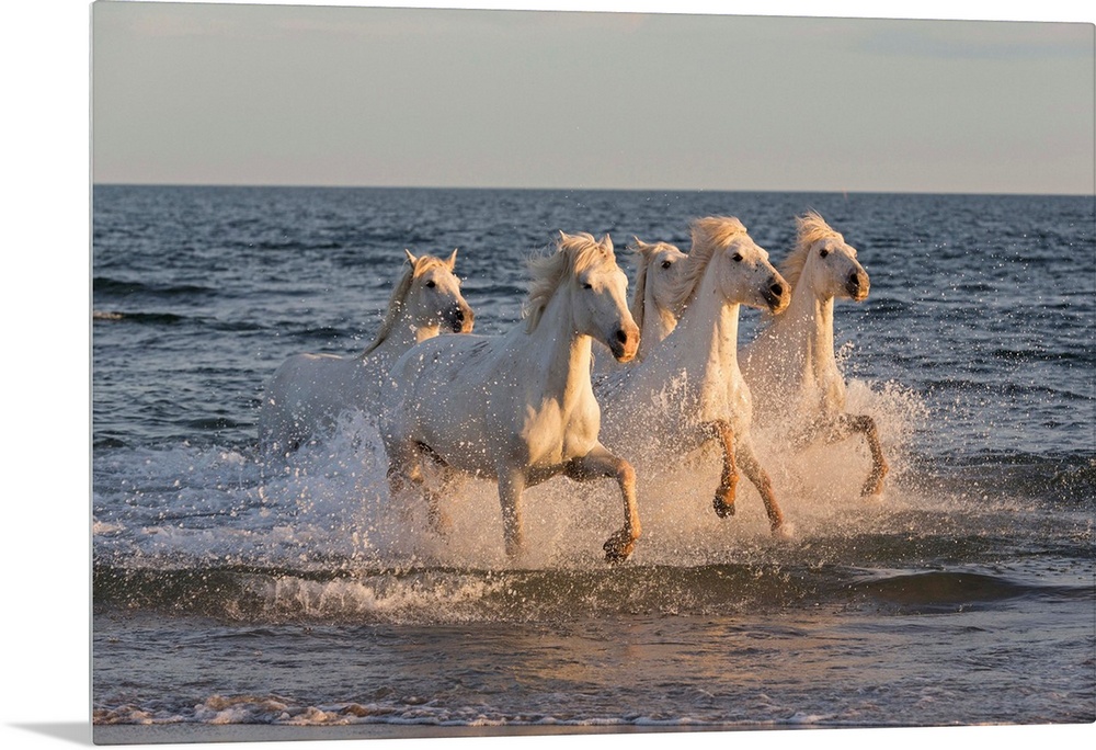 <p>France, Provence, Camargue, White horses of the Camargue run through the mediterranean sea</p>