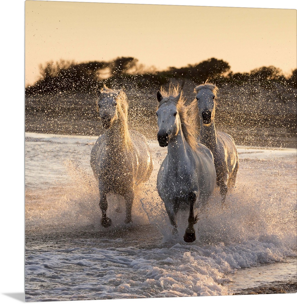 <p>France, Provence, Camargue, White horses of the Camargue run through the surf in the mediterranean sea , with the spray backlit at dusk</p>