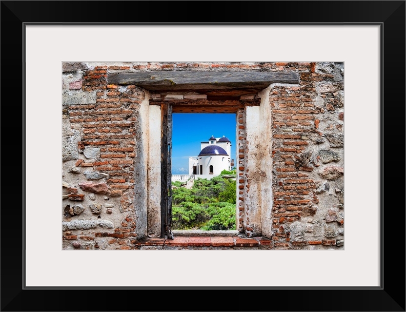 <p>View of a white house in Isla Mujeres, Mexico, framed through a stony, brick window. From the Viva Mexico Window View.</p>