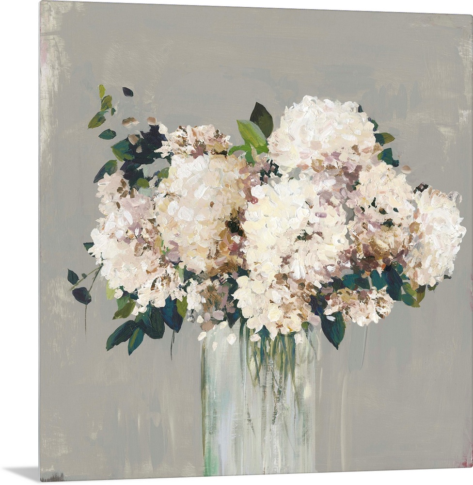 <p>Bouquet of hydrangeas painted with a subdued color palette.</p>
