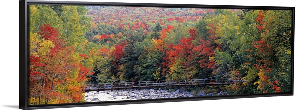 <p>A suspension foot bridge passes over a boulder filled river in this panoramic photograph wall art.</p>