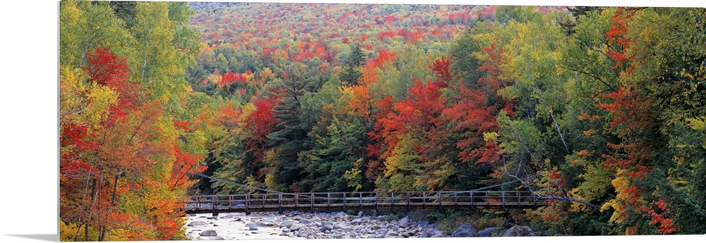 <p>A suspension foot bridge passes over a boulder filled river in this panoramic photograph wall art.</p>