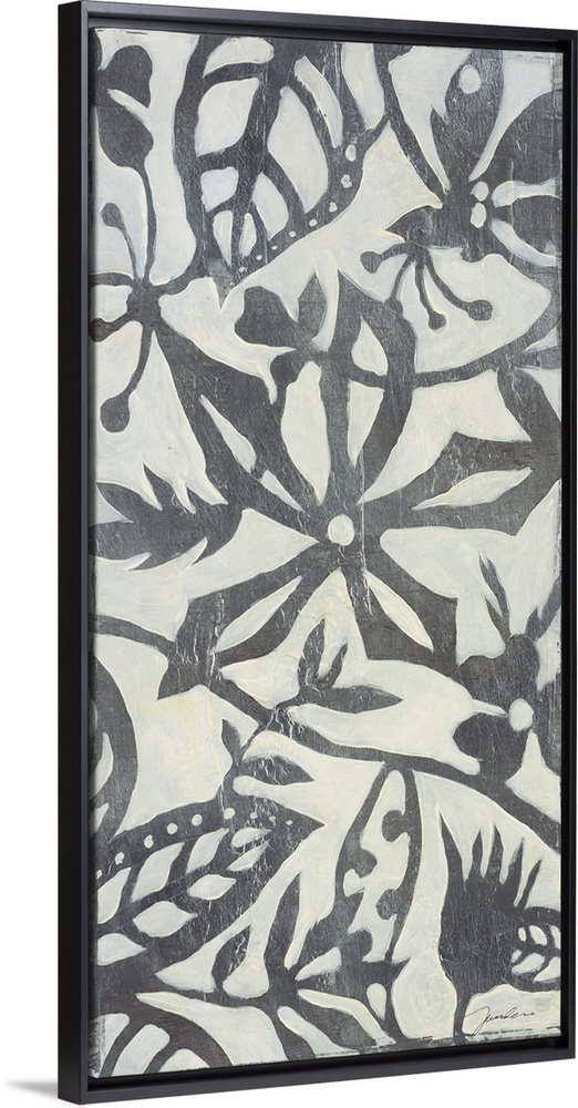 <p>A long vertical design of a metallic silver and white floral pattern.</p>