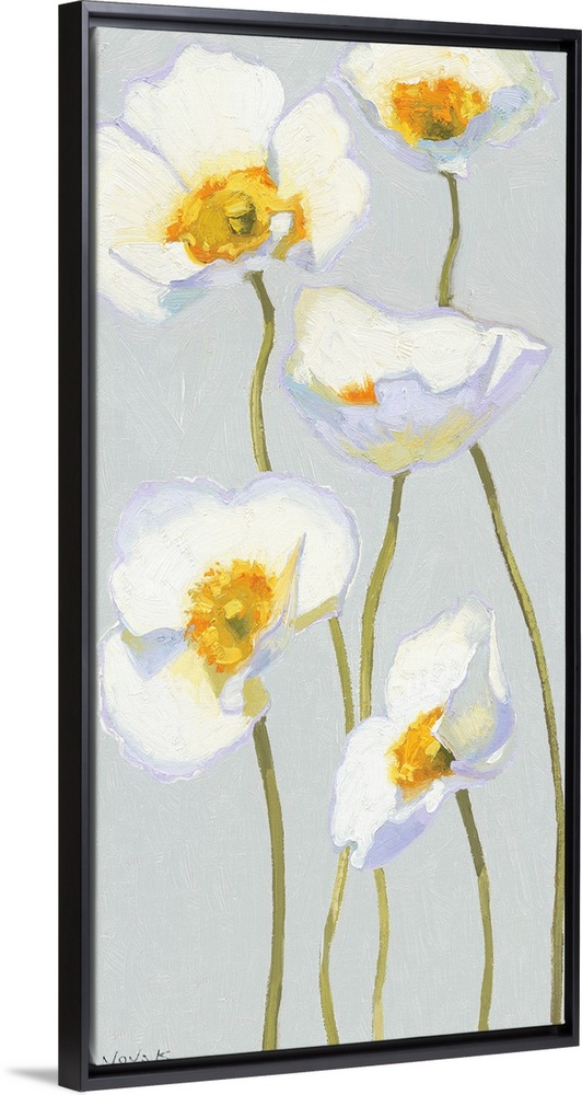 <p>Giant, vertical, floral painting of five white poppy flowers on thin, waving stems, extending upward on a neutral background.</p>