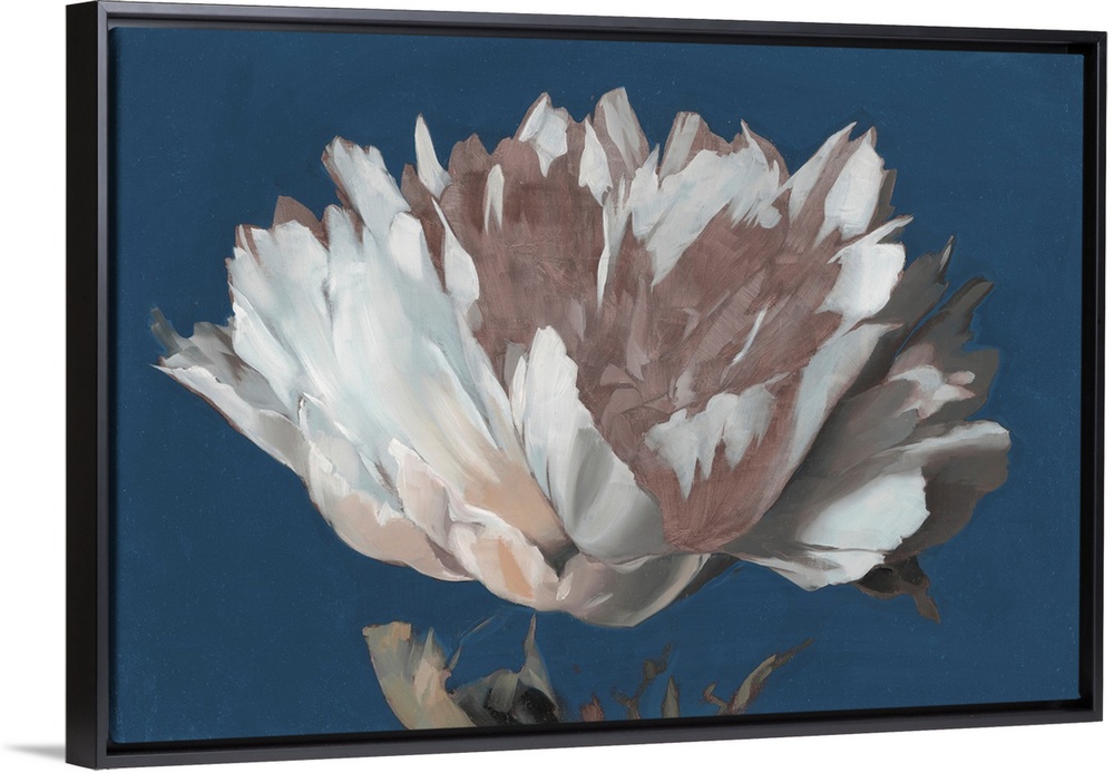 <p>A bold contemporary floral painting of a single white and blush peony flower against a strong blue background. Painted in a slightly abstracted style</p>