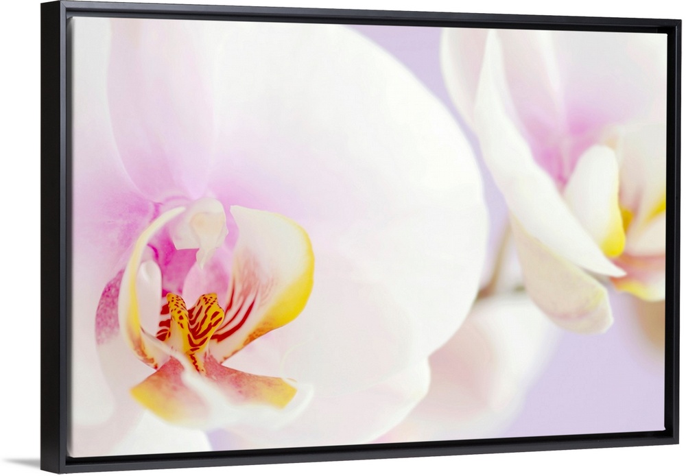 <p>Macro shot of two orchids in bloom with pale petals and a blurred background.</p>