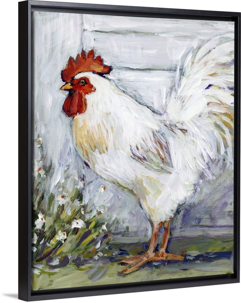 <p>This white rooster struts his stuff in this bold abstract farm scene.</p>