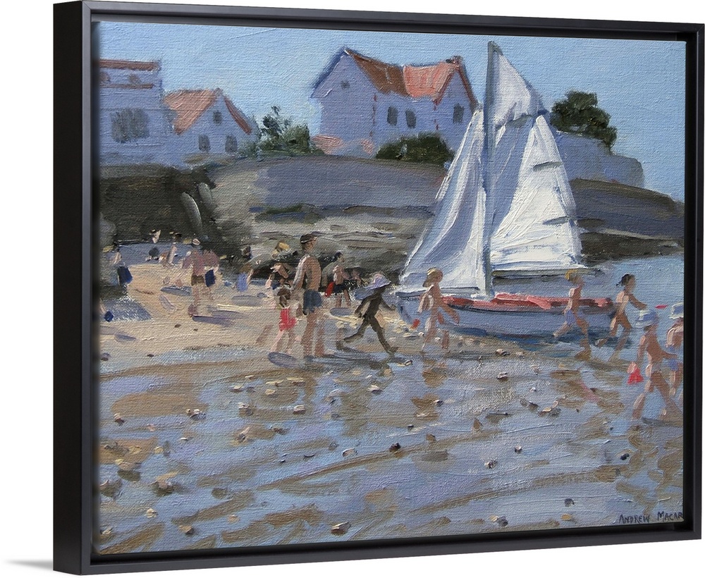 <p>Contemporary painting of a crowd on the beach with a small sail boat sitting on the edge of the water as children walk into the ocean.</p>