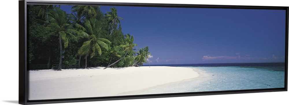 <p>Panoramic photograph shows a dense forest lined with palm trees sitting near the edge of a beach while the waves of the Indian Ocean slowly make their way onto shore.</p>