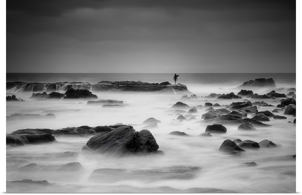 <p>A figure stands in the distance on a rock protruding from the misty ocean.</p>