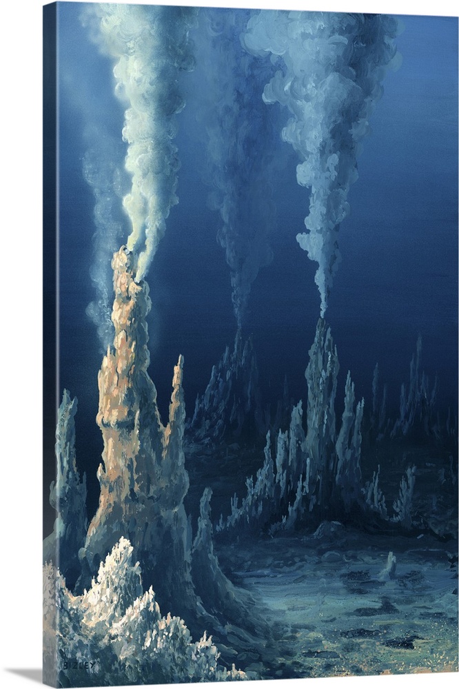 <p>White smoker hydrothermal vents, artwork. These structures form around geologically active seabed vents where magma (molten rock) near the surface heats water in the rock to extremely high temperatures. The hot water dissolves a large quantity of mineral salts. When the superheated water meets the cold surrounding water, the minerals rapidly precipitate out, giving the hot water its characteristic smoky appearance. The minerals form crusts around the vent, causing them to grow into tall chimneys over time. Black smokers emit darker-coloured minerals than lighter-coloured minerals from white smokers. See C016/5351 for protocells originating here.</p>