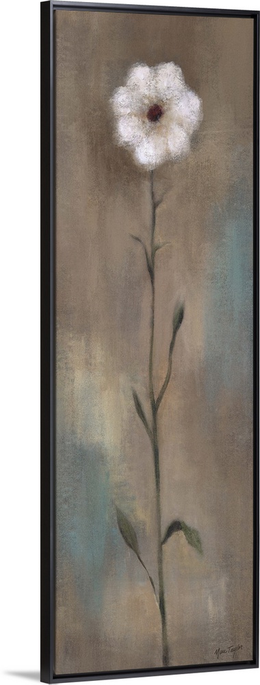 <p>Contemporary painting of a single white flower with a long stem against an earth toned background.</p>