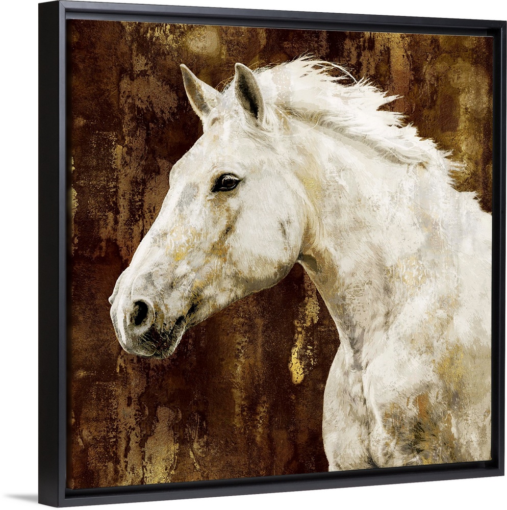 <p>Square decor of a white stallion with its head down on a silver background and gold streaks running over the top.</p>