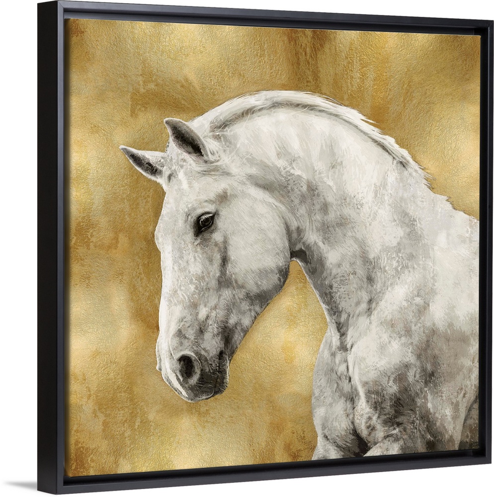 <p>Square decor with a white stallion on a metallic gold background.</p>