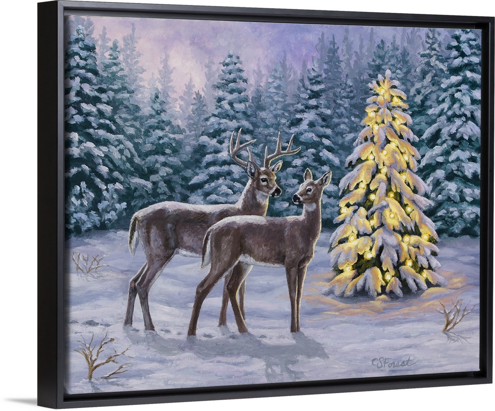 <p>A pair of deer standing in the snow next to a lit Christmas tree.</p>