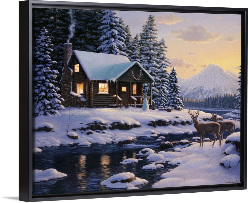 <p>Contemporary painting of a cabin in the wilderness in winter.</p>