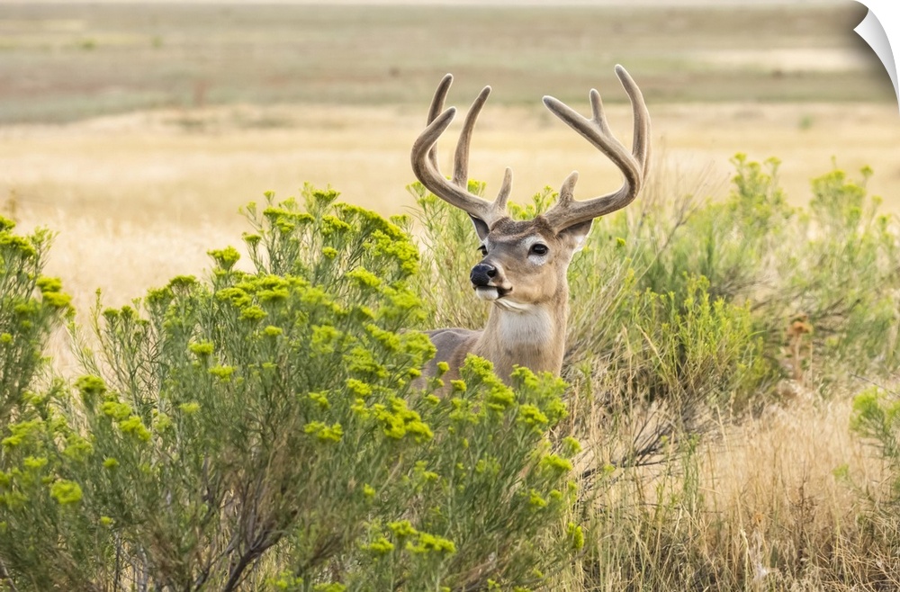 <p>White-tailed deer buck (Odocoileus virginianus) standing and looking out from behind a shrub; Emporia, Kansas, United States of America</p>