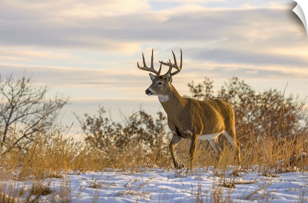 <p>White-tailed deer buck (Odocoileus virginianus) walking through a field with a covering of snow; Emporia, Kansas, United States of America</p>
