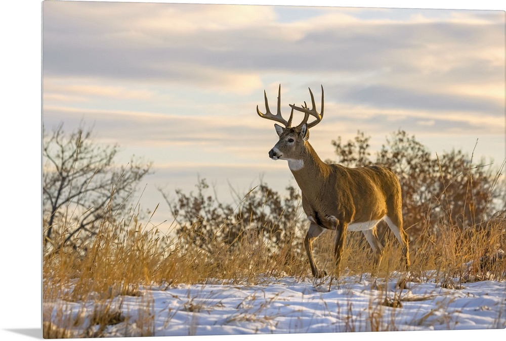 <p>White-tailed deer buck (Odocoileus virginianus) walking through a field with a covering of snow; Emporia, Kansas, United States of America</p>