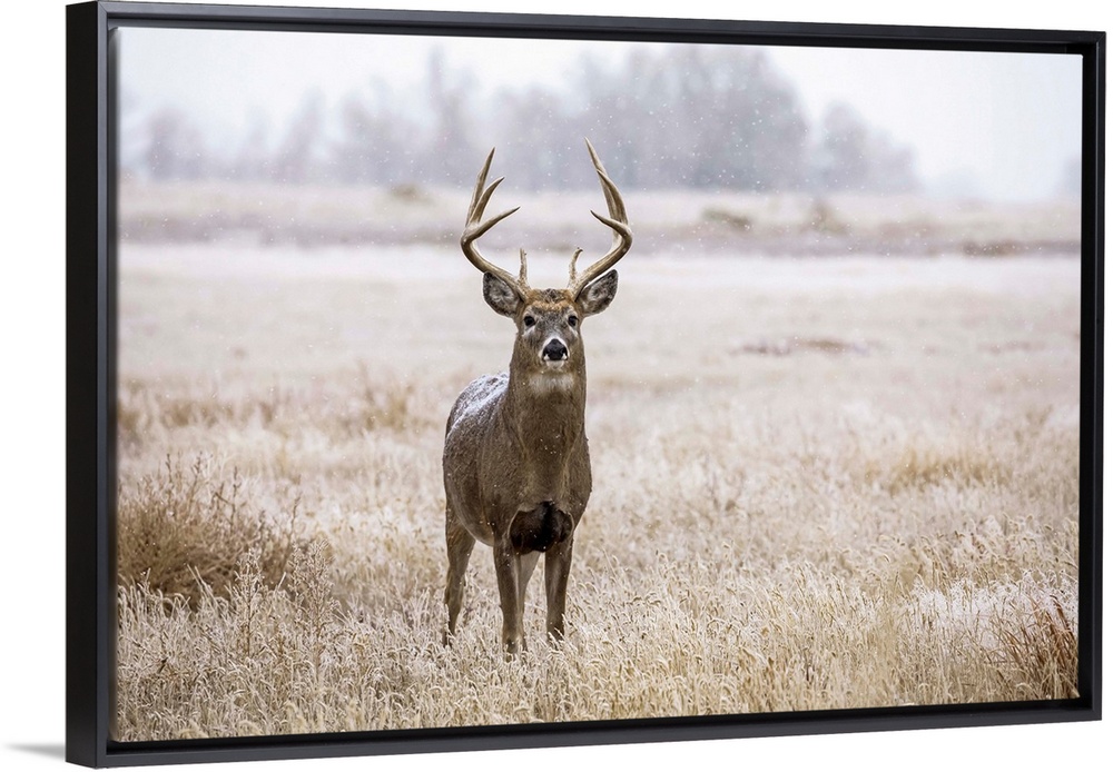 <p>White-tailed deer buck (Odocoileus virginianus) standing in a field during a light snowfall; Emporia, Kansas, United States of America</p>