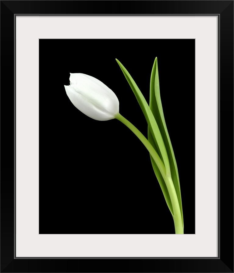 <p>Closeup photograph of a white tulip flower and its stem on a black background.</p>