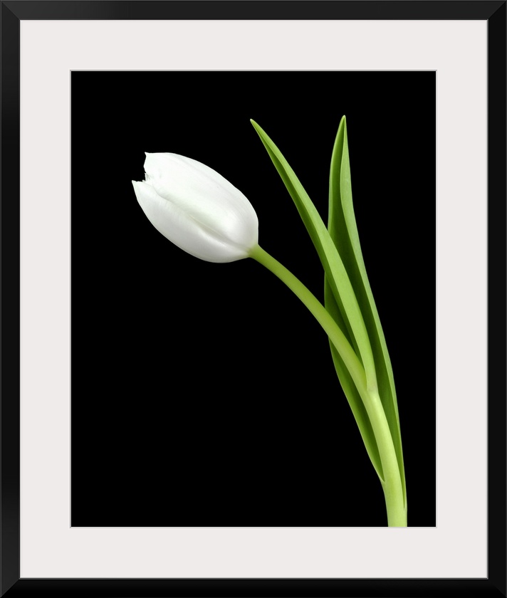 <p>Closeup photograph of a white tulip flower and its stem on a black background.</p>