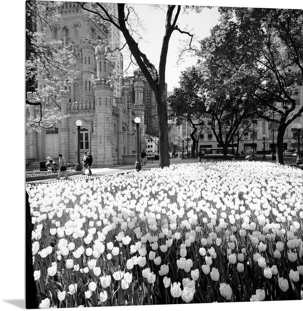 <p>Square photo print of flowers in a garden in Chicago with tall buildings in the background.</p>