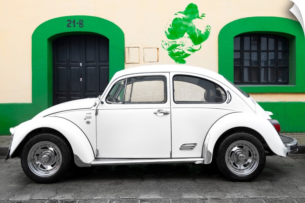 <p>Photograph of a classic white Volkswagen Beetle parked in front of a building with a green trim wall and green graffiti. From the Viva Mexico Collection.</p>