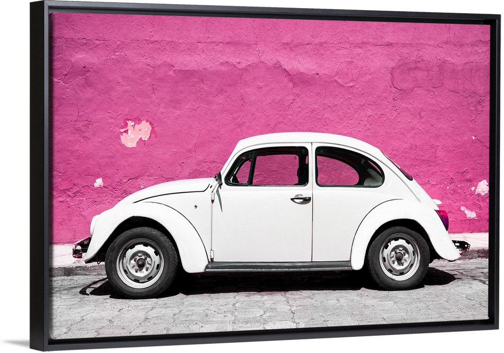 <p>Photograph of a class white Volkswagen Beetle parked in front of a bright pink wall in Mexico. From the Viva Mexico Collection.</p>