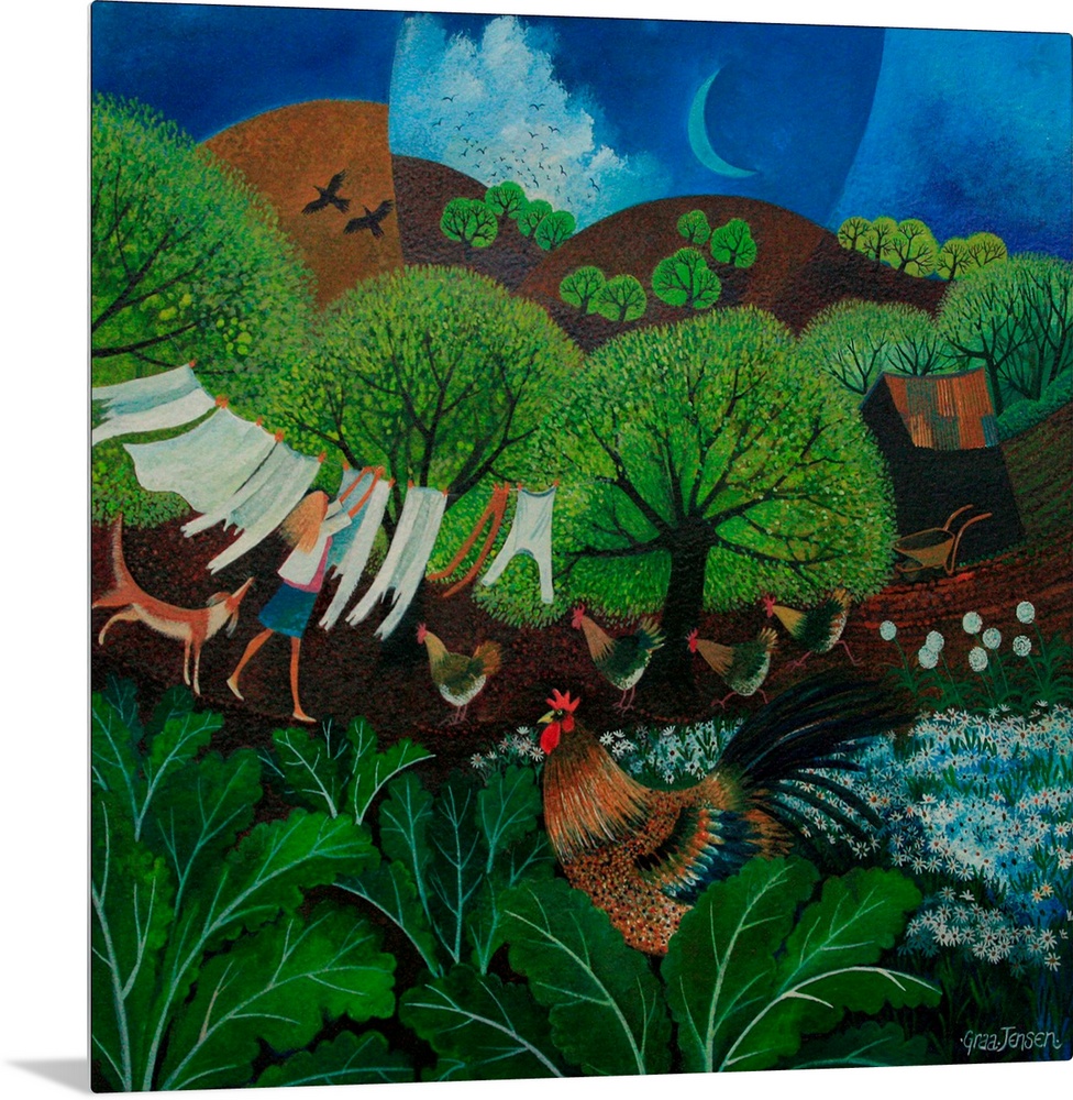 <p>Contemporary painting of a woman hanging laundry with chickens nearby.</p>