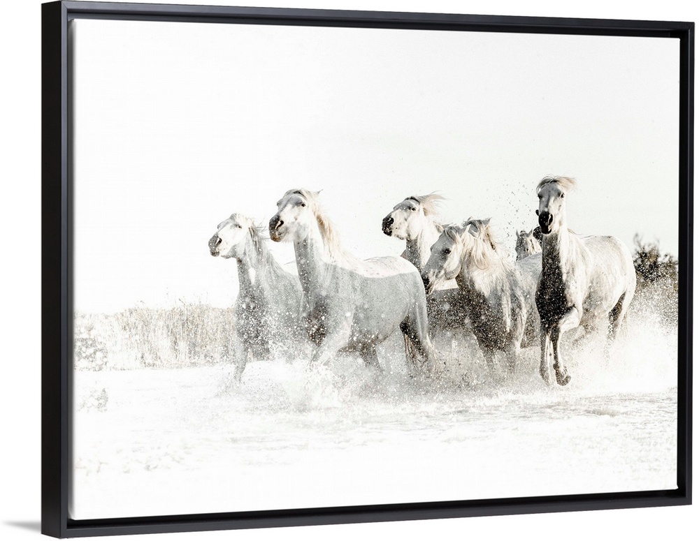 <p>Action photograph of white horses running through water with a blown out white background.</p>