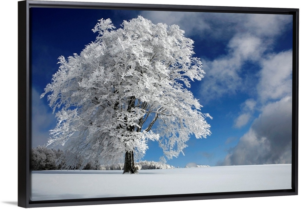 <p>A German winter landscape with a tall tree covered in white foliage.</p>