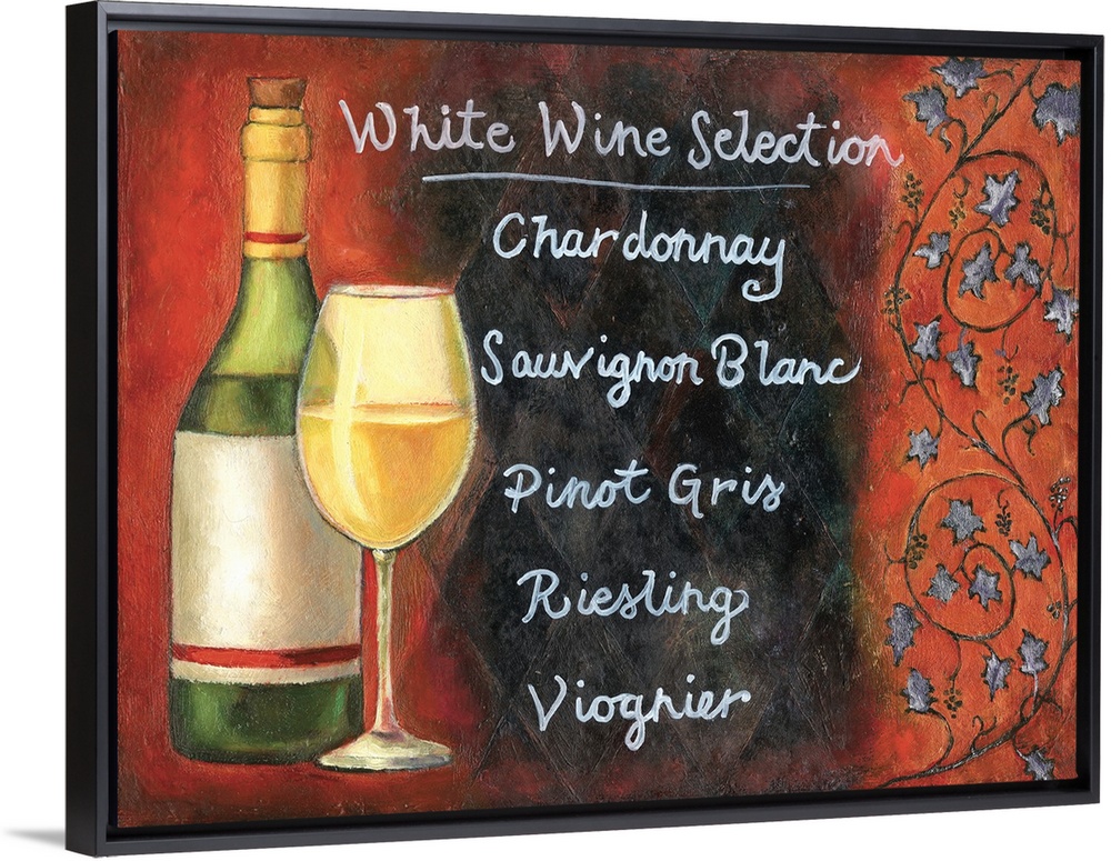 <p>A list of white wine options next to a wine glass and bottle with a red background.</p>