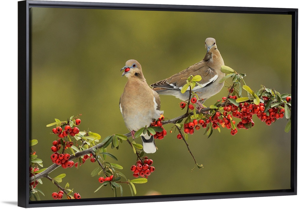 <p>White-winged Dove (Zenaida asiatica), adults eating Firethorn (Pyracantha coccinea) berries, Hill Country, Texas, USA</p>