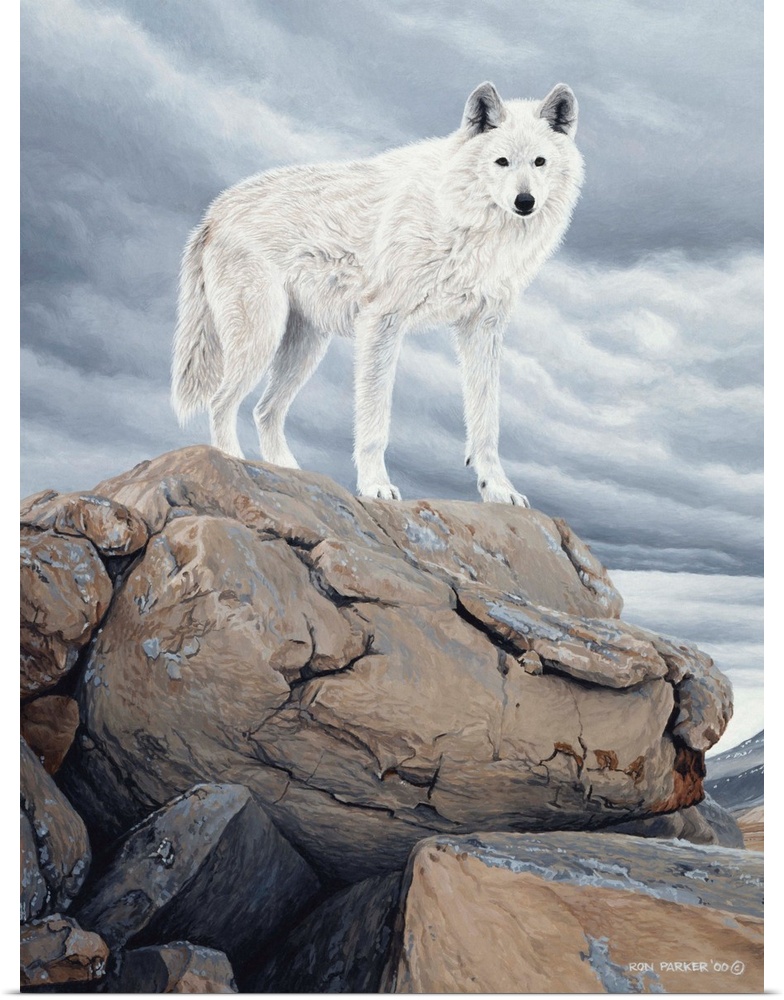 <p>A white wolf stands on a rock face.</p>