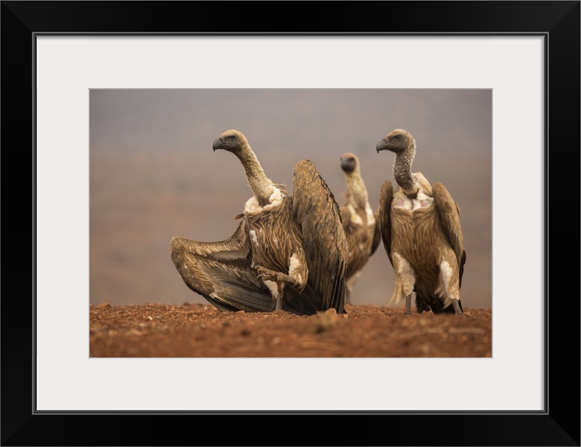 <p>Whitebacked vultures (Gyps africanus) moving in to feed, Zimanga private game reserve, KwaZulu-Natal, South Africa, Africa</p>