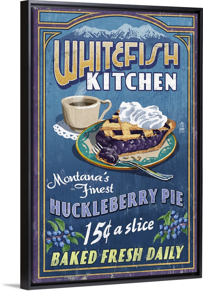 <p>Retro stylized art poster of a sign with a slice of huckleberry pie and a cup of coffee.</p>