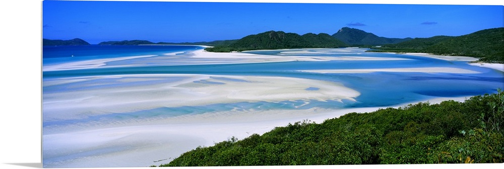<p>Panoramic view of white beaches and water surrounded by hills and dense forest.</p>