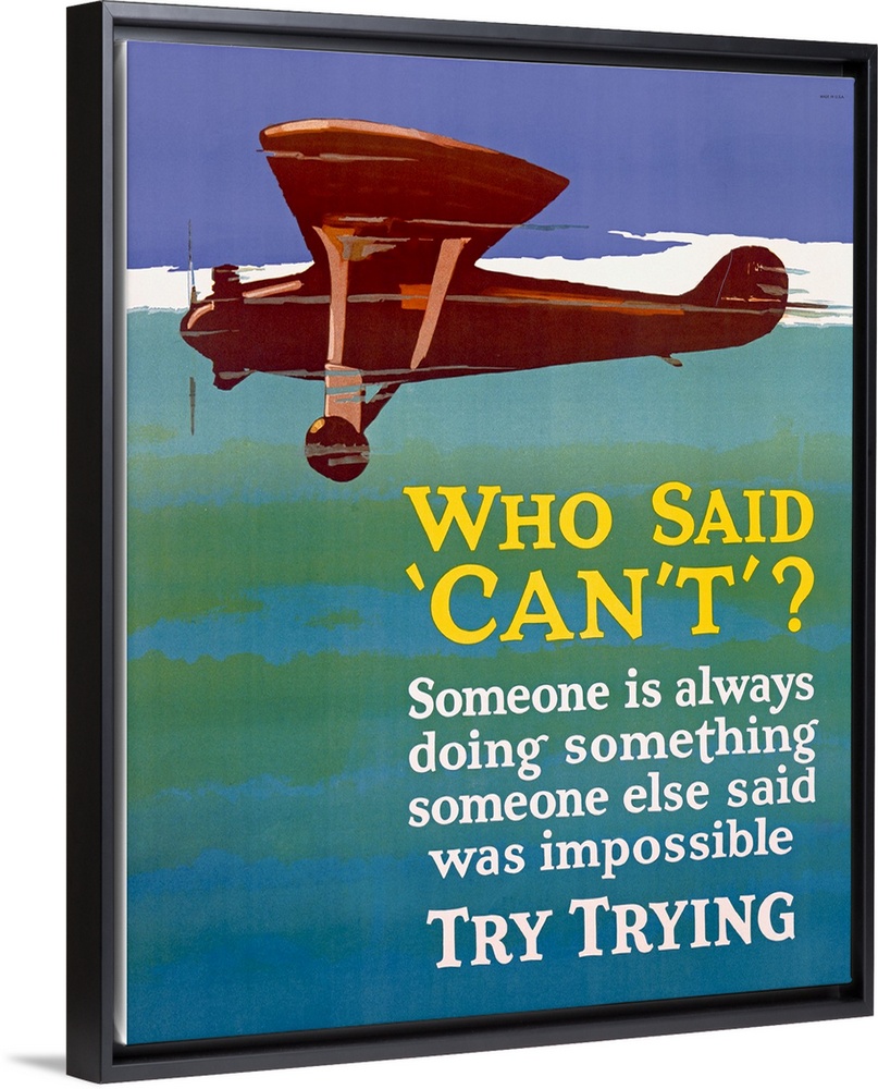 <p>Old print of plane flying through sky with inspirational text below.</p>