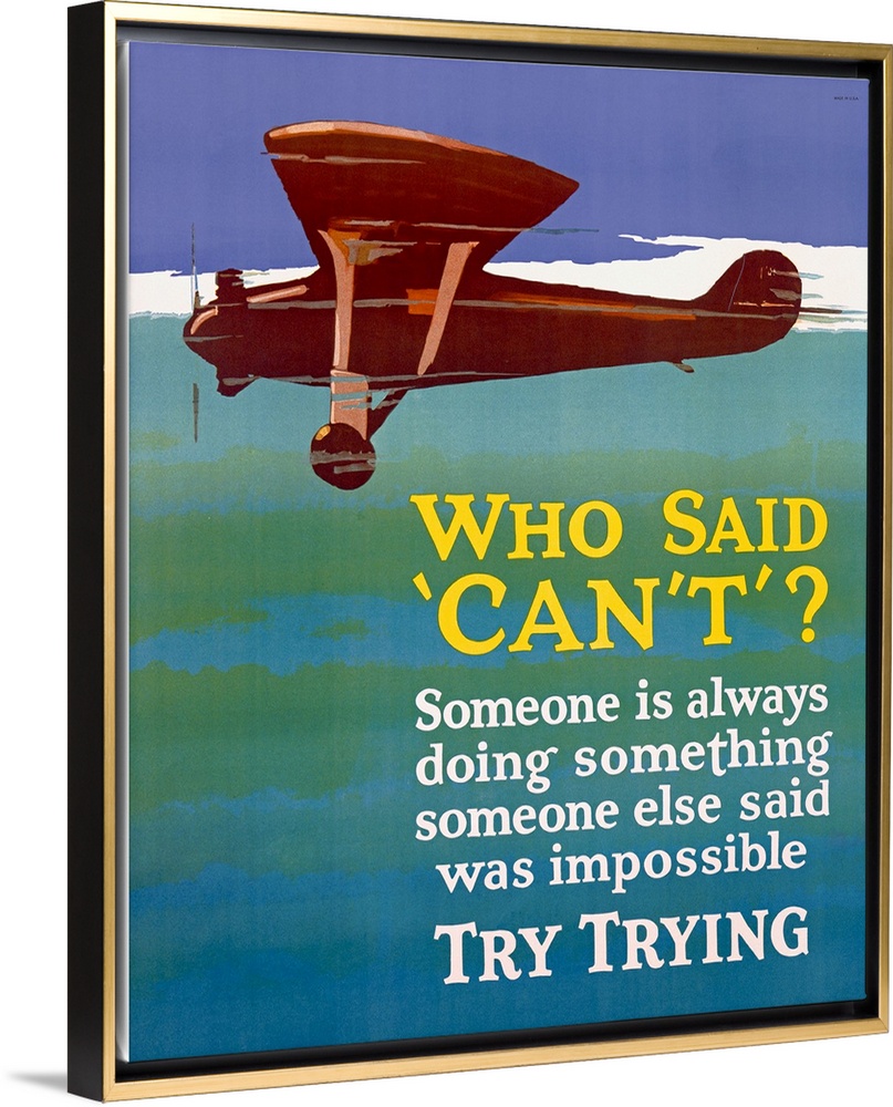<p>Old print of plane flying through sky with inspirational text below.</p>