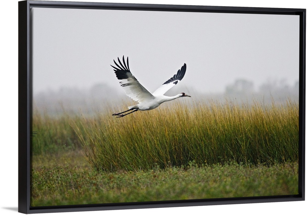 <p>Whooping Crane (Grus americana) endangered species, flying over salt marsh at Aransas National Wildlife Refuge, Texas, USA, January.</p>