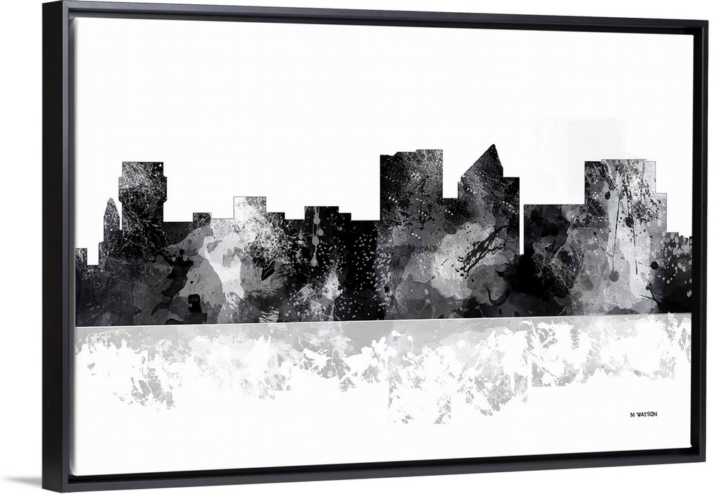 <p>Contemporary black and white watercolor skyline casting a mirror-like reflection below.</p>