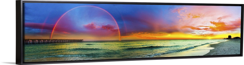 <p>A wide panorama of a double rainbow over the beach in Florida.</p>