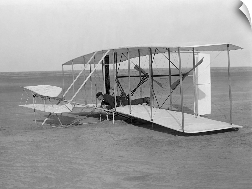 <p>December 14, 1903 - Wilbur Wright lying in a damaged prototype after an unsuccessful flying attempt in Kitty Hawk, North Carolina.</p>